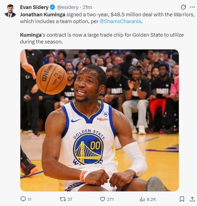 对此NBA记者埃文-斯迪瑞写道:库明加与勇士签下两年4850万含有球队选项的合同,那么他的合同在本赛季会成为勇士队可利用的一大交易筹码。