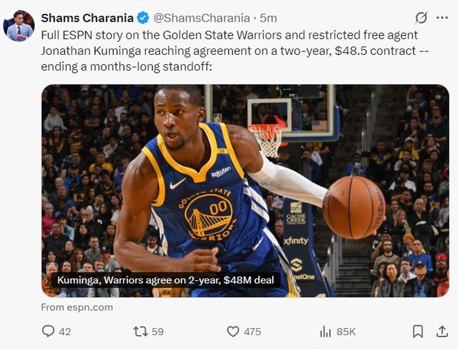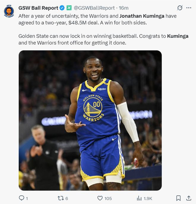 勇士媒体:经过一个夏天的拉锯战,勇士队最终与库明加达成协议,这份两年4850万的合同是双赢的结果,勇士队可以全身心投入到赢球的征程中,恭喜勇士管理层说服了库明加保留球队选项。