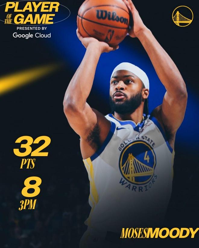 凭借这样的表现,穆迪成为库里之外勇士队史第二位能够单场交出至少32分4篮板3抢断8记三分,且真实命中率88%的球员。